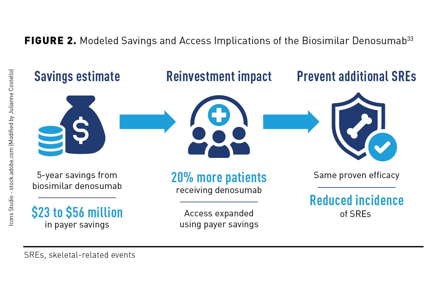 Biosimilars can reduce the economic burden of cancer care and expand access to essential supportive therapies. By introducing price competition, biosimilars have helped lower oncology drug spending, which is expected to exceed $150 billion by 2027.30 New biosimilars—along with generics—have saved patients with cancer more than $22 billion, enabling earlier and broader use of BMAs without compromising outcomes (panel transcript, unpublished, June 2025).1,31,32 Recent modeling of biosimilar denosumab shows $23 to $56 million in payer savings over 5 years for a 1-million-member health plan. Reinvestment with those savings could help about 20% more patients receive denosumab and prevent additional SREs at the same efficacy (Figure 2).33 As Lyman noted, “Biosimilars do offer opportunities…to expand access to bone-modifying agents like denosumab without necessarily compromising clinical outcomes (panel transcript, unpublished, June 2025).” Wilson shared that this expansion is important since financial toxicity often forces patients to delay or avoid bone-protective biologics (panel transcript, unpublished, June 2025).“The period in between care if you are delaying because of insurance is frightening,” he said (panel transcript, unpublished, June 2025).