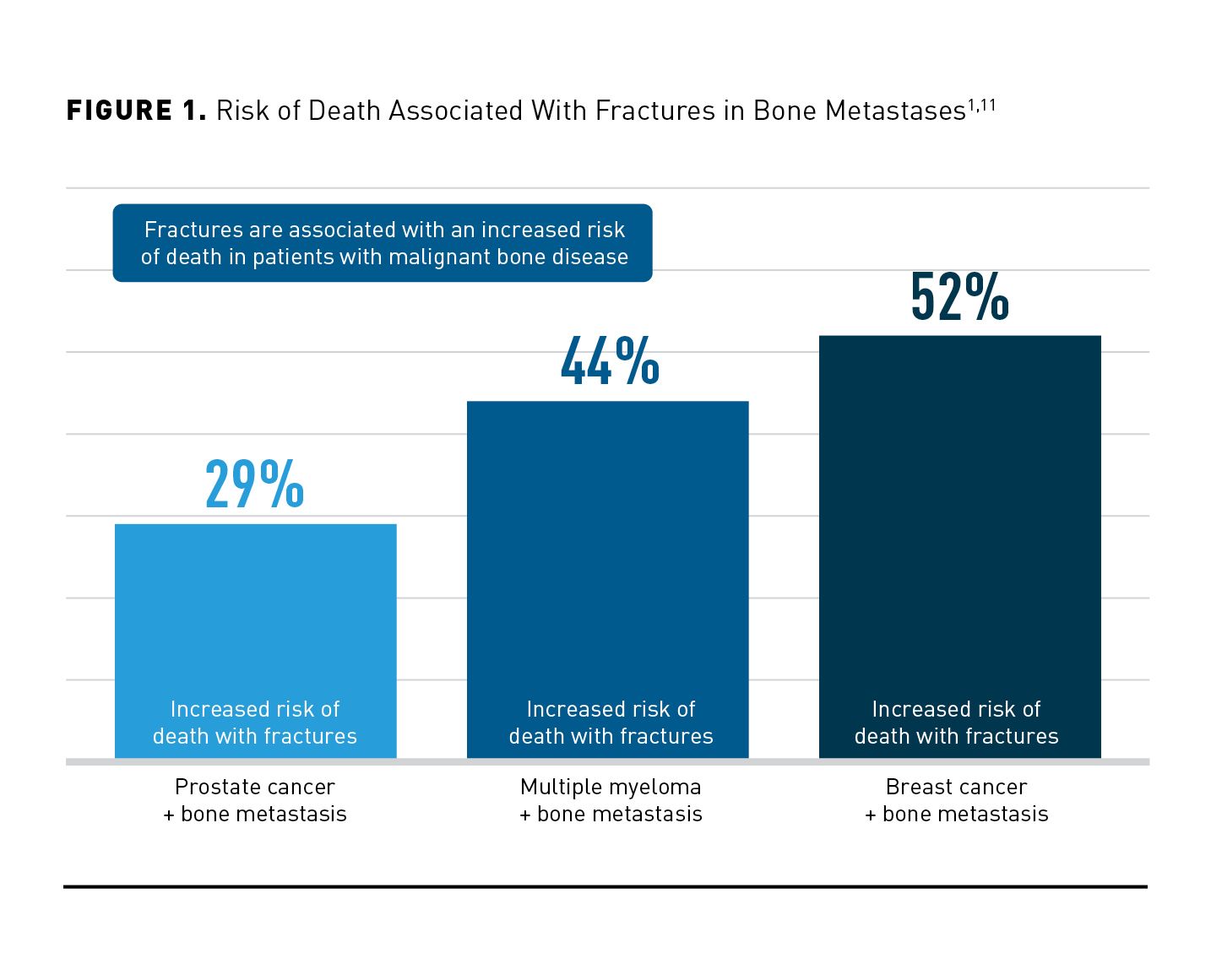 Fragility fractures are also widespread in the general population. Osteoporosis-related hip fractures have a global survival rate of between 17% to 27%, and patients can face irreversible decline (panel transcript, unpublished, June 2025). Hip fracture mortality in the US is also high at about 21% after 1 year, and survivors often experience early declines in independence and QOL.8,9 In oncology, SREs add significant morbidity and mortality, with only about 30% of patients surviving 12 months after a pathologic fracture.10 Fractures increase mortality by 30% to 50% beyond metastasis alone; in prostate cancer, the risk of death rises 29%, and in breast cancer, 52% (Figure 1; panel transcript, unpublished, June 2025).1,11 Other high-risk oncology settings have similar patterns. In multiple myeloma, for example, real-world evidence shows that fractures are associated with a 44% increased risk of death (panel transcript, unpublished, June 2025).1,11